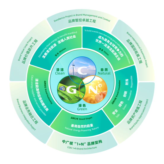 集團品牌理念體系模型,基于“清潔能源供應(yīng)商和服務(wù)商”的品牌定位,進一步闡釋了“發(fā)展清潔能源,造福人類社會”的品牌使命,描繪了“成為具有全球競爭力的世界一流清潔能源企業(yè)”的品牌愿景,強化了以“Clean、Green、Natural”為核心的品牌主張,品牌口號“善用自然的能量”生動傳遞了中廣核與自然共生共榮的價值理念。整個體系突顯了以“安全、綠色、創(chuàng)新、擔當”為核心要素的品牌內(nèi)涵,展現(xiàn)出中廣核堅守核安全生命線、走綠色發(fā)展道路、堅持創(chuàng)新是第一動力、堅持勇于擔當為國盡責(zé)的堅定承諾。