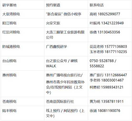 各基地專屬工業研學預約渠道如下,如因客觀原因導致無法聯絡,可通過“硬核WALK”工業旅游小程序直接聯系各基地負責人。全年開放不打烊,趕緊帶上家人、約上同學,走進核電基地,解鎖大國重器的奧秘,讓科學夢想照亮成長之路!