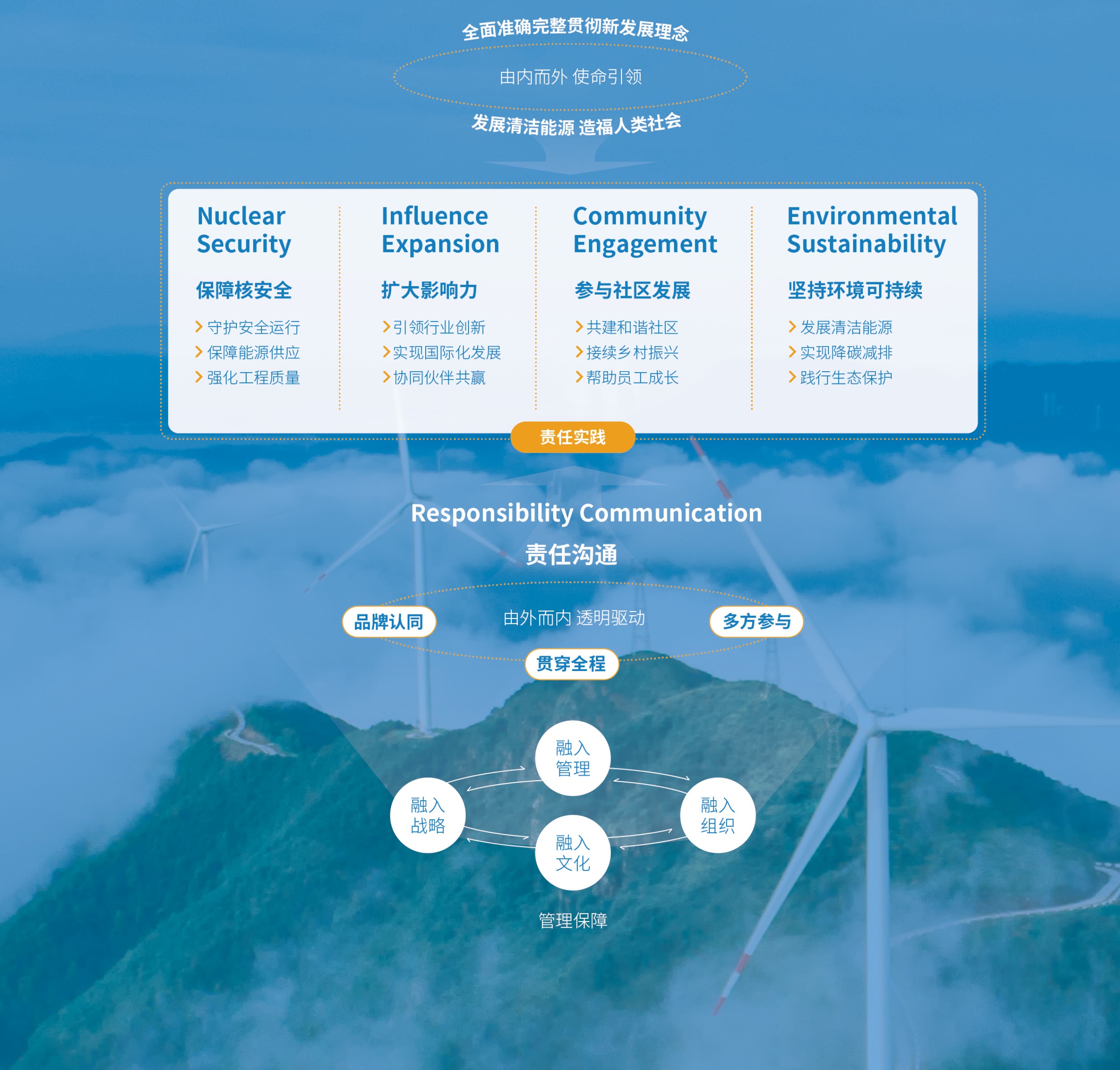 NICER 模式意在強化社會責任文化、戰略、組織、管理保障的基礎上,積極推動保障核安全(Nuclear Security)、擴 大影響力(Influence Expansion)、參與社區發展(Community Engagement)、堅持環境可持續(Environmental Sustainability) 等社會責任實踐更精、更實、更深, 并持續加強與社會各界的透明責任溝通(Responsibility Communication),以更務實的行動實現更高質量、更有效率、更加公平、更可持續、更為安全的發展。